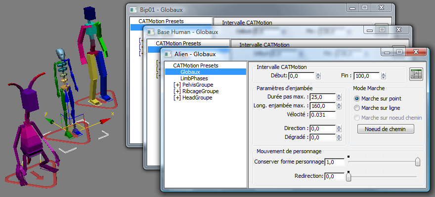 Tous les aspects d'un mouvement particulier (par exemple, la façon dont le bassin se déplace) disposent de leur propre commande de spline. La combinaison d'un si grand nombre de contrôleurs offre de nombreuses possibilités d'animations distinctes.