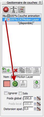 Editeur CATMotion dans le panneau déroulant Gestionnaire de couches. Ce bouton remplace le bouton Afficher le gizmo de transformation de couche lorsqu'une couche est mise en surbrillance dans la liste.