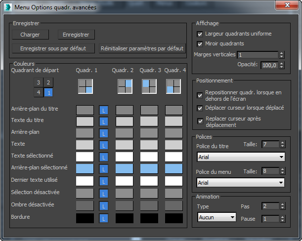 La boîte de dialogue Options avancées du menu Quadr. permet de personnaliser la taille et les couleurs des menus Quadr. Il est également possible de personnaliser d'autres comportements du menu Quadr. tels que le repositionnement, la taille des polices et le comportement du curseur.