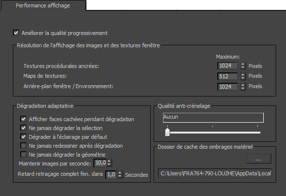 Les paramètres d'affichage progressif et de dégradation adaptative sont enregistrés dans le fichier de scène MAX.