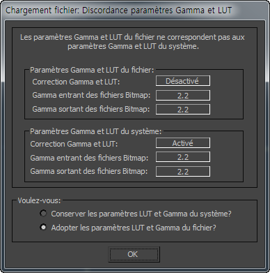 Les paramètres de correction Gamma et LUT sont enregistrés avec les valeurs par défaut du marché pour l'IU personnalisée courante. Reportez-vous à la rubrique Changeur d'interface utilisateur personnalisée et de paramètres par défaut. Si vous ouvrez ou fusionnez une scène ayant des paramètres Gamma et LUT différents des paramètres actifs de 3ds Max, une boîte de dialogue s'affiche et vous propose de choisir entre utiliser les paramètres courants et adopter ceux du fichier en cours de chargement. Par exemple :