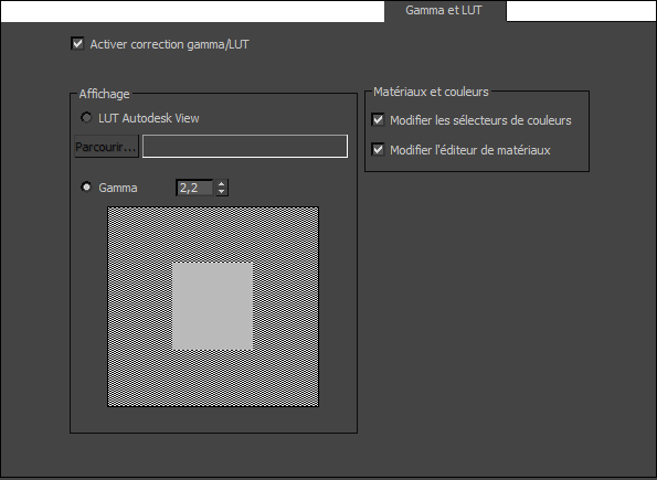 L'affichage de la correction gamma ou des tableaux de recherche s'applique aux fenêtres et à la fenêtre image rendu. Les commandes de cette zone vous permettent de charger un LUT Autodesk View ou de régler le gamma numériquement.