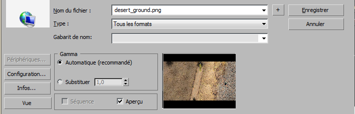 Lorsque vous enregistrez un fichier bitmap, 3ds Max enregistre la valeur gamma si cela est possible. Une fois encore, il utilise un gamma de 2.2 pour les fichiers 8 ou 16 bits, et de 1.0 pour les fichiers à virgule flottante ou logarithmiques.