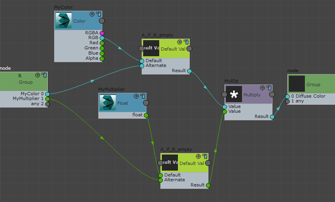 Vous pouvez ajouter un noeud de valeur par défaut à votre graphique. De cette manière, MyColor fournit une valeur d'entrée par défaut, tandis que l'utilisateur peut également fournir une autre valeur d'entrée. Si une autre valeur est fournie, c'est cette dernière qui est utilisée. Sinon, c'est la valeur par défaut qui est utilisée.