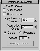 Définit le rapport hauteur/largeur du faisceau lumineux rectangulaire. Le bouton Ajustage bitmap permet de faire correspondre le rapport hauteur/largeur à celui d'un bitmap spécifique. Valeur par défaut : 1,0.