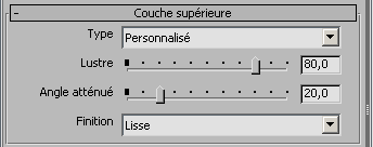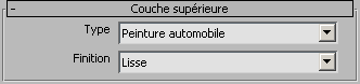 Le matériau peinture métallisée est toujours associé à un revêtement supérieur clair. Les paramètres de ce panneau déroulant vous permettent de régler la brillance et la texture du revêtement supérieur.