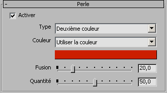 Lorsque l'option Deuxième couleur est activée, vous pouvez choisir une couleur pour compléter l'effet de perle et ajuster la valeur de Fusion, entre 0,0 et 100,0 (valeur par défaut = 20,0). 0,0 affiche uniquement la couleur de base et 100,0 n'affiche que la couleur complémentaire. Avec une deuxième couleur, vous pouvez également ajuster la valeur Quantité.