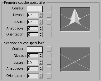 Les zones Première couche spéculaire et Seconde couche spéculaire possèdent des contrôles identiques, qui peuvent avoir des valeurs différentes.