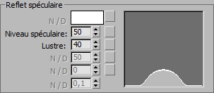 Cela a pour effet de modifier l'intensité de la courbe du reflet ainsi que les reflets dans l'aperçu. Lorsque le niveau spéculaire est égal à 0 %, il n’y a aucun reflet. Lorsqu'il est égal à 100 %, la courbe atteint sa hauteur maximale, sans surcharge. Si la valeur est supérieure à 100 %, la courbe est surchargée : elle s'élargit et une plus grande zone a une intensité de reflet maximum.