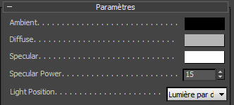 Les groupes de fonctions qui apparaissent au-dessous du panneau déroulant Ombrage DirectX et au-dessus du panneau déroulant Technique représentent l'interface de l'ombrage choisi. Ces groupes de fonctions sont spécifiques à chaque ombrage.