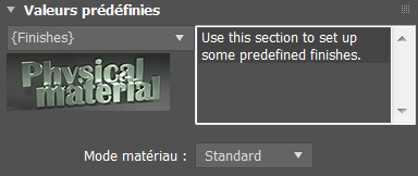 Le panneau déroulant Valeurs prédéfinies permet d'accéder aux valeurs prédéfinies de matériau physique pour créer rapidement différents types de matériaux tels que la céramique émaillée, le vieux cuivre ou la cire de bougie.