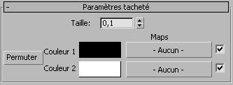 Tacheté est une map 3D qui génère un motif de surface tacheté qui est utile en tant que map Couleur diffuse ou map Relief pour créer des surfaces imitant le granit et d'autres motifs.