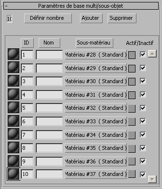 Lorsque vous réduisez le nombre de sous-matériaux, ceux-ci sont supprimés en fin de liste. Vous pouvez annuler la modification du champ Définir nombre lorsque cette modification a servi à supprimer des matériaux.