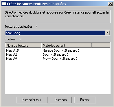 Lorsque vous sélectionnez une texture dans la liste Textures dupliquées, 3ds Max affiche ses doublons dans la liste Doubles, qui présente les noms des textures et les noms des matériaux parent. Le nombre après " Doubles " indique le nombre de copies trouvées dans la scène. Les textures de cette liste peuvent être sélectionnées individuellement. Seuls les doublons sélectionnés dans cette liste seront consolidés dans l'instance finale si vous cliquez sur le bouton Instance. L'instance créée prend le nom du premier doublon sélectionné dans la liste.