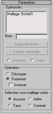Les options de cette zone vous permettent de spécifier le niveau de sélection qui sera passé aux modificateurs plus haut dans la pile. L’objet FusionForme stocke tous les niveaux de sélection, c’est-à-dire qu'il stocke les sommets, les faces et les arêtes de la forme fusionnée avec l'objet (si vous appliquez un modificateur Sélection maillage, puis vous déplacez à différents niveaux de sous-objet, vous verrez que la forme fusionnée est sélectionnée). Ainsi, si vous sélectionnez FusionForme puis appliquez un modificateur qui opère à un niveau spécifique (par exemple Extrusion face), ce modificateur opérera correctement.