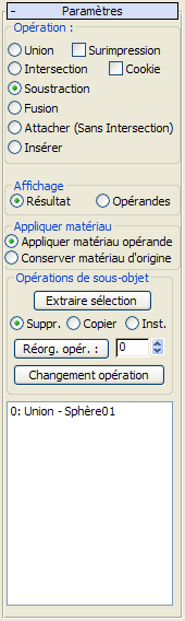 Remarque : l'intégralité de l'historique des opérandes et des opérations utilisés pour créer l'objet booléen est reporté dans la liste de vue hiérarchique au bas du panneau déroulant Paramètres. Box01 commence le Booléen par l'Union, Sphere01 est ensuite incorporé avec l'Intersection, Box02 est incorporé avec l'Union, et enfin Cylinder01 est incorporé avec la Soustraction.