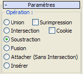ProBoolean prend en charge les opérations Union, Intersection, Soustraction, Fusion, Joindre et Insérer. Les trois premières opérations fonctionnent de manière similaire à leurs homologues de l'objet composé booléen standard. L'opération de Fusion entrecoupe et combine deux maillages sans retirer aucun des polygones d'origine. Cela peut s'avérer utile lorsqu'il faut retirer de manière sélective des pièces du maillage.