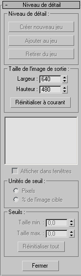 Lorsque vous ouvrez l'utilitaire Niveau de détail, ces paramètres sont définis en fonction de la taille de sortie de rendu courante. A l'aide des champs à double flèche, vous pouvez changer ces paramètres en indiquant une autre résolution. Lorsque vous modifiez la taille de l'image cible alors que l'option % de l'image cible est sélectionnée, les valeurs de la zone Seuils changent également.