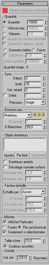 - Cette valeur en lecture seule indique le nombre total de particules calculées au préalable pour l'émission. Comme la texture animée n'atteindra peut-être pas le niveau de blancheur nécessaire sur la surface de l'émetteur, cette valeur est généralement inférieure aux valeurs Quantité ou Vitesse max. *(Arrêt-Départ).