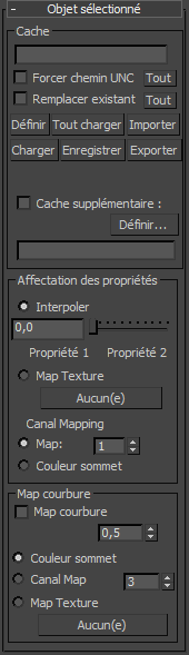 Le panneau déroulant Objet sélectionné vous permet de contrôler les caches des simulations, de contrôler et éventuellement d'animer les propriétés du tissu à l'aide d'une texture ou d'une interpolation et de spécifier une texture de courbure. Ce panneau déroulant ne s'affiche qu'en cas de sélection d'un seul objet de la simulation.