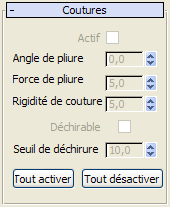 Désactive toutes les coutures du vêtement sélectionné. Ce bouton désactive la case à cocher Actif pour toutes les coutures.