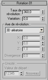 Le paramètre Unicité affecte le caractère aléatoire de la variation du taux de révolution, de l'axe de révolution avec l'option 3D aléatoire et Divergence utilisé avec les autres options.