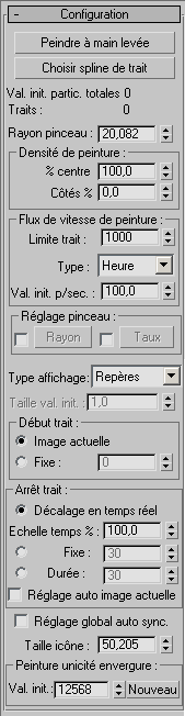 Les paramètres du panneau déroulant Configuration déterminent la densité et l’emplacement des valeurs de départ particules ainsi que la synchronisation des traits.