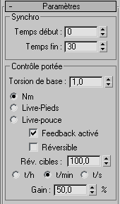 - Spécifie le nombre maximum de révolutions effectuées avant que le feedback ne prenne effet. La vitesse est spécifiée en unités parcourues par image. Cette option est disponible uniquement si vous avez activé l'option Feedback activé.