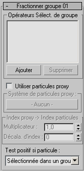 Répertorie les opérateurs Sélection de groupe contenant la sélection de particules à fractionner. S'il n'existe qu'un seul opérateur Sélection de groupe dans l'événement, cet opérateur sera automatiquement ajouté à la liste.
