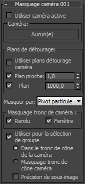- Permet de spécifier la caméra à utiliser pour masquer les particules. Cliquez sur le bouton Aucun, puis choisissez une caméra dans la scène à utiliser pour le masquage de caméra. Le nom de la caméra apparaît alors sur le bouton. Cette option est uniquement disponible lorsque l'option Utiliser la caméra active est désactivée.