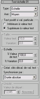 Par défaut, le test d'échelle redevient positif si la valeur testée est supérieure à celle du test, sauf si vous avez préalablement activé l'option Inférieure à valeur test. Par exemple, si vous définissez les paramètres Type sur Echelle et Valeur de test sur 150, et Variation sur 0, puis que vous sélectionnez l'option Inférieure à valeur test, les particules ne se déplacent vers l'événement suivant que si leur facteur d'échelle est inférieur à 150 %.