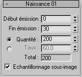 Vous pouvez spécifier un nombre total de particules ou le taux de naissance des particules par seconde. Il est également possible d'indiquer au système quand commencer à émettre des particules et quand s'arrêter.