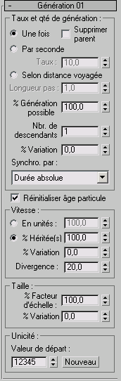Utilisez ces paramètres pour indiquer à quelle fréquence les particules doivent être engendrées, le système de mesure à utiliser, ainsi que d'autres valeurs concernant le nombre de particules engendrées.