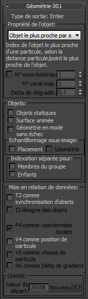 Avec des propriétés "... sommet", comme Illumination sommet, l'option est activée par défaut mais elle ne peut pas être désactivée et est intitulée I3 désigne objet/sommets, car, pour ces propriétés, l'entrée I3 définit les index d'objet/sommet d'où obtenir les propriétés. Pour les propriétés "... sommet", cette entrée est un index composé (index d'objet/index de sommet) ; pour toutes les autres options (où l'état par défaut est désactivé), il s'agit d'un simple index d'objet.