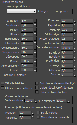 Sauvegarde vos paramètres de Propriétés du tissu dans un fichier que vous pourrez charger ultérieurement. Par défaut, tous les fichiers de valeurs prédéfinies du modificateur Tissu sont sauvegardées dans le dossier \scenes\cloth.