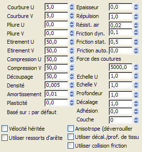 résistance à la compression. Bien que ces valeurs soient fixées par défaut à 50, comme leur contrepartie Etirement, assigner des valeurs inférieures aux valeurs Etirement peut donner de bons résultats car lorsque le tissu est comprimé sur toute la longueur de ses fibres, il a tendance à gondoler plutôt qu'à rétrécir.