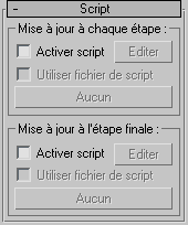 Lorsque l'option Utiliser fichier de script est désactivée, il s'agit du script de mise à jour à chaque étape par défaut (3dsmax\scripts\particleflow\example-finalstepupdate.ms). Lorsqu'elle est activée, il s'agit du script que vous avez chargé (le cas échéant). Si vous n'avez pas chargé de script, cliquez sur Editer pour afficher la boîte de dialogue Ouvrir.
