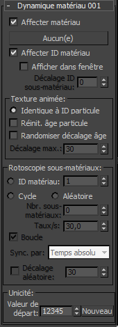 Sélectionnez toujours l'option Identique à ID particule avec une texture animée et, si vous utilisez un matériau composé, l'une des options Rotoscopie sous-matériaux.