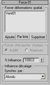 Remarque : par défaut, ces déformations spatiales de force ont la même influence sur les particules Particle Flow que sur les systèmes de particules dans 3ds Max 2 : Réseau de particules, Super Gouttelettes, Blizzard et Nuage particules. Pour obtenir une influence sur les particules Particle Flow équivalente à celle des systèmes de particules Gouttelettes et Neige de 3ds Max 1, définissez l'option Influence sur 100,0.