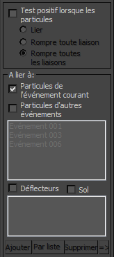 Les paramètres de cette zone permettent de spécifier les autres entités de la simulation avec lesquelles une particule peut se lier. Il peut s'agir de particules de l'événement courant, de particules situées dans d'autres événements, de déflecteurs, du sol ou d'une combinaison de ces éléments.