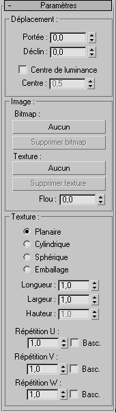 Ces options permettent de sélectionner le bitmap ou la texture à utiliser pour le déplacement.