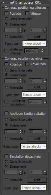 La synchronisation de l'option Désactiver la simulation peut être contrôlée par les paramètres de temps de cette zone, comme pour la synchronisation dans la zone Faire correspondre la position ou la vitesse (voir ci-dessus).
