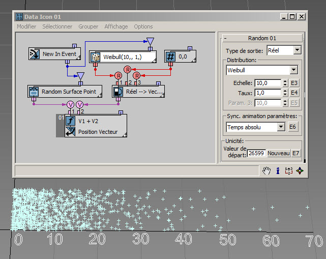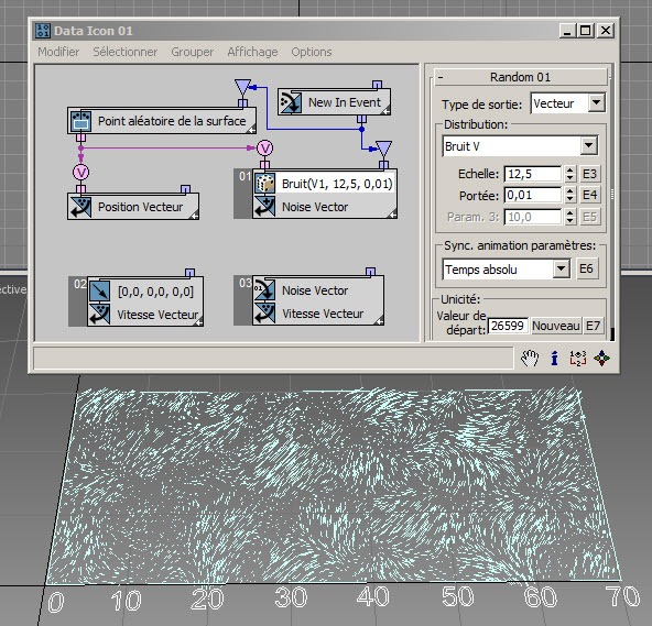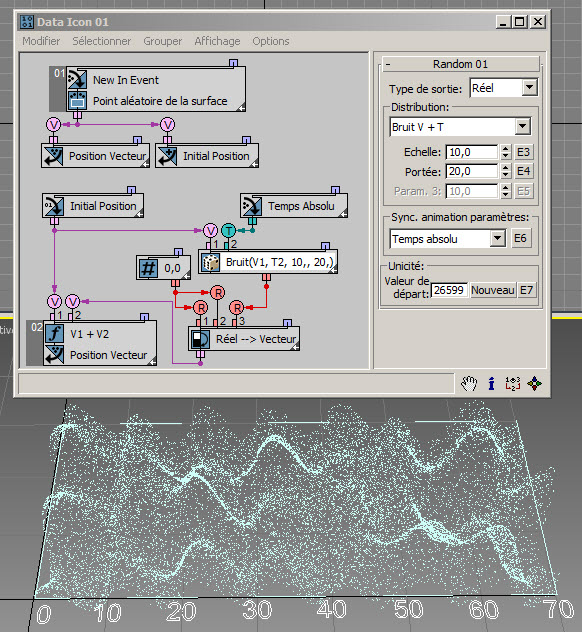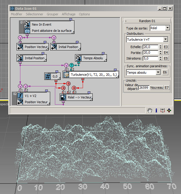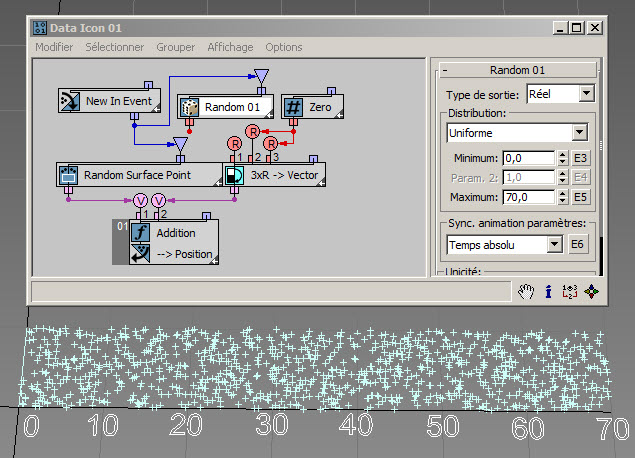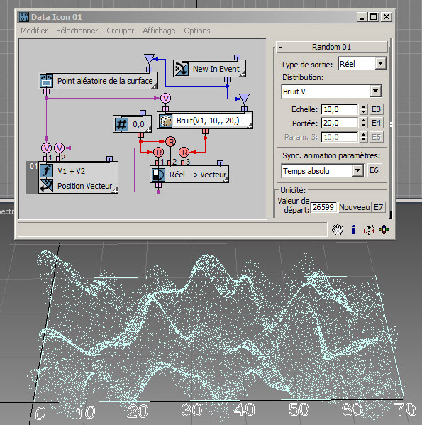 Dans l'exemple suivant ( RandomTemplate08.max ), les particules sont placées de manière aléatoire sur la surface de l'icône de l'opérateur de données, puis la position est utilisée comme entrée du sous-opérateur Aléatoire avec l'option Bruit V. Les données de sortie sont utilisées pour définir la hauteur des particules (axe Z).