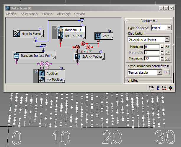 Vous allez commencer par une forme simple de distribution : le type Discontinu uniforme. C'est le seul type disponible si le type de données défini dans le sous-opérateur Aléatoire est Entier. Discontinu est l'opposé de continu. Le sous-opérateur Aléatoire génère des données de type Entier (c'est en ce sens qu'il est discontinu) uniformément réparties entre les valeurs minimale et maximale définies dans l'interface utilisateur. Dans l'exemple suivant ( RandomTemplate01.max ), les valeurs maximale et minimale sont définies sur 0 et 30. Par conséquent, vous pouvez voir que les positions des particules sont réparties le long des lignes d'ordonnées X : 0, 1, 2, 3, etc. jusqu'à 30. Pour des informations théoriques sur la distribution discontinue, consultez Loi uniforme discrète.