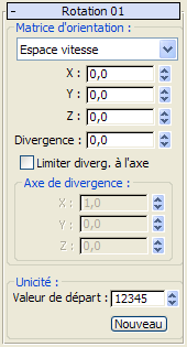Utilisez les paramètres X/Y/Z pour spécifier l'orientation de toutes les particules. Le paramètre Divergence n'est pas disponible avec l'option Adopter espace de vitesse.
