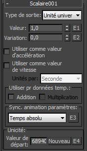 Définissez explicitement une valeur selon laquelle la valeur de sortie peut varier ou activez E2 et reliez un sous-opérateur Paramètre au sous-opérateur Scalaire pour permettre à l'utilisateur de spécifier la variation. Disponible pour tous les types de sortie, à l'exception de Booléen.