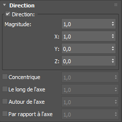 - Définit la direction de l'accélération dans l'espace objet du noeud de champ.