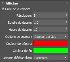 - Permet d'utiliser l'échelle de vélocité qui définit les facteurs d'échelle appliqués aux composants X, Y et Z des vélocités des particules. Les vitesses obtenues avec des valeurs supérieures à 1.0 peuvent être très élevées. Il peut donc s'avérer nécessaire de limiter les vitesses lors de l'utilisation de l'échelle de vélocité.