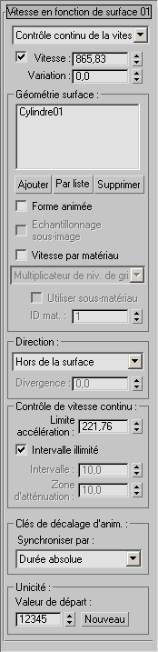 Lorsque vous choisissez l'option Contrôle continu de la vitesse, les commandes ci-dessous deviennent disponibles. Ces commandes permettent essentiellement aux particules de se déplacer à l'intérieur de la région de l'objet Géométrie surface plutôt qu'en ligne droite à partir de l'émetteur.