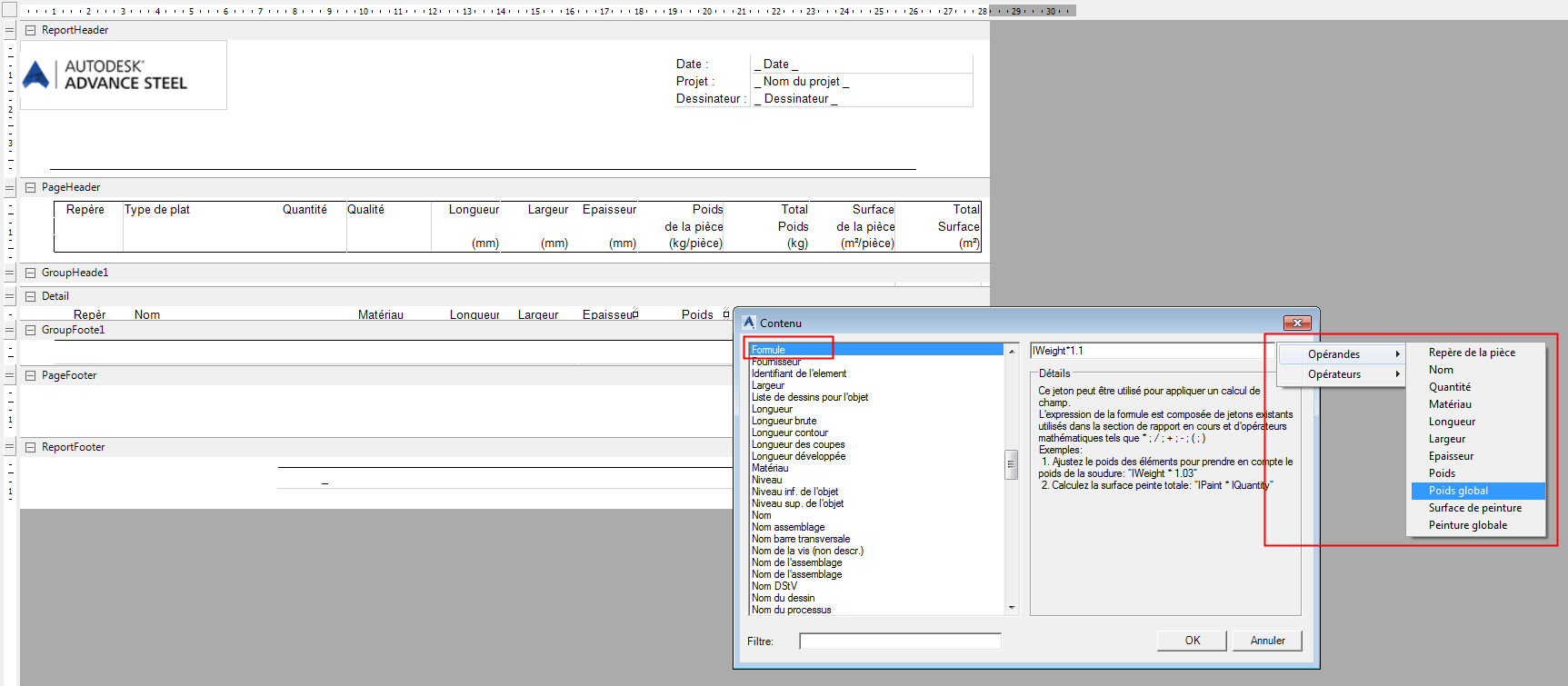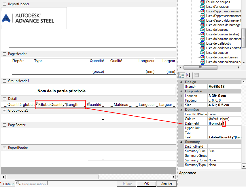 Vous pouvez inclure plusieurs formules dans le même gabarit Nomenclature, mais chacun d'eux doit posséder un ID unique, contrôlé par le paramètre DataField, disponible dans les propriétés de chaque cellule du gabarit :